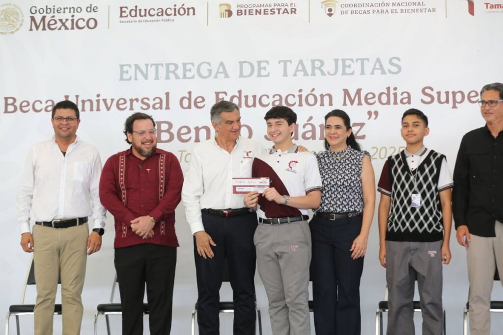 Tampico, Tam.- Un total de 450 alumnos del CETIS número 22, turno matutino, de esta ciudad, recibieron de manos del gobernador Américo Villarreal Anaya y del delegado de Bienestar Federal, Luis Lauro Reyes Rodríguez, las tarjetas de la Beca Universal de Educación Media Superior «Benito Juárez», lo que representa la dispersión de un millón 710 mil pesos.